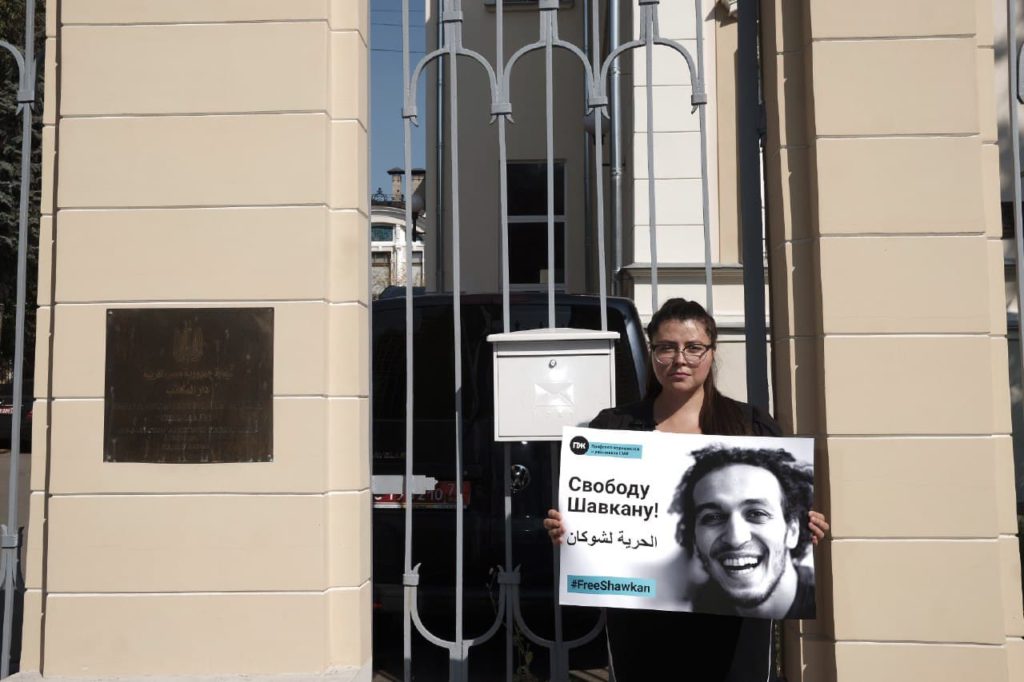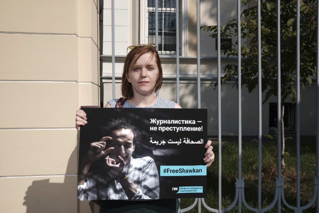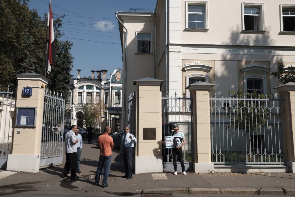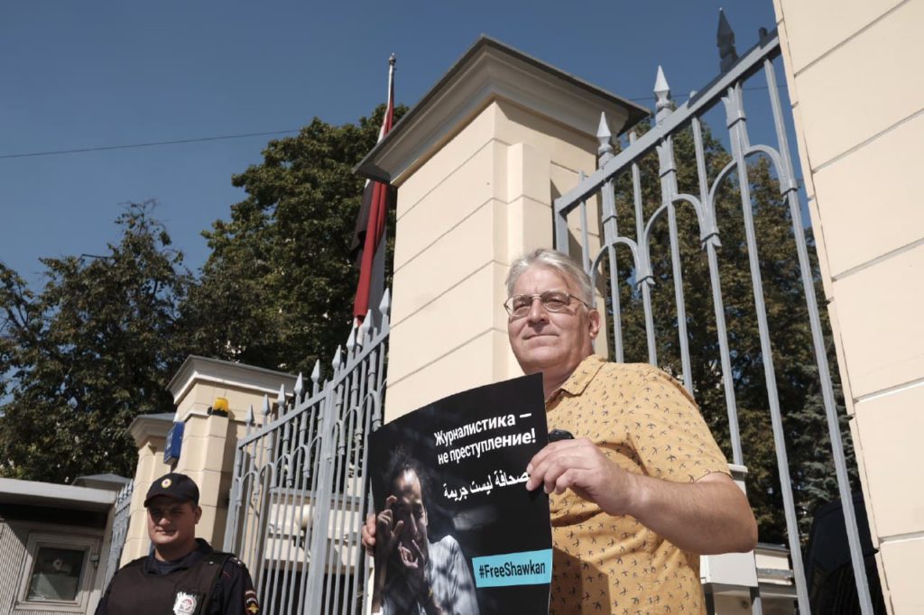 Группа представителей Профсоюза журналистов провела в пятницу 7 сентября 2018 года у посольства Египта в Москве одиночные пикеты с требованием немедленно освободить египетского фотожурналиста Махмуда Абу Зейда, также известного как Шавкан, которому грозит смертная казнь.
